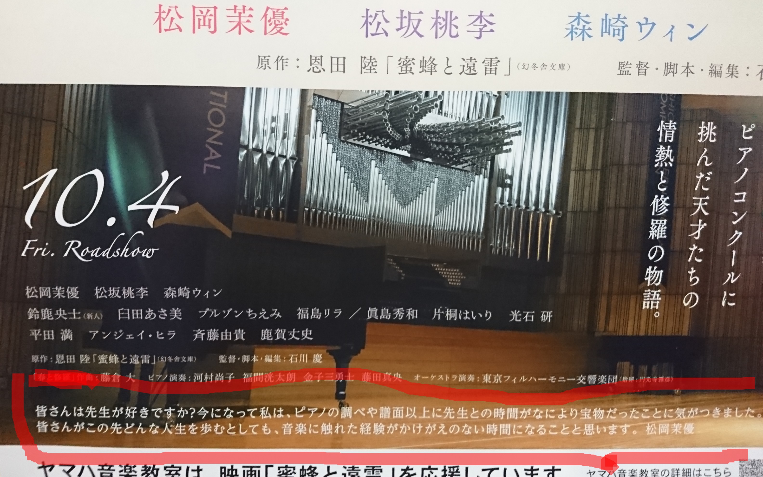 先日、某所で今月公開になった映画『蜜蜂と遠雷』のポスターを見ました。